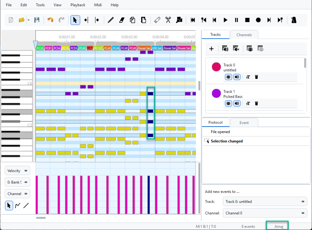 Below the notes the other events are shown. The row names below the piano roll indicate the event type shown in each row.